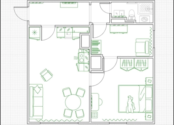 Симпатичная кухня-гостиная для уютных семейных вечеров, отдельно спальная с широкой кроватью. Установлены кондиционеры.