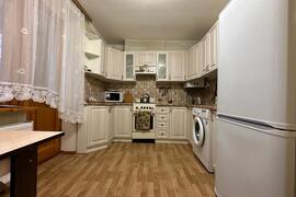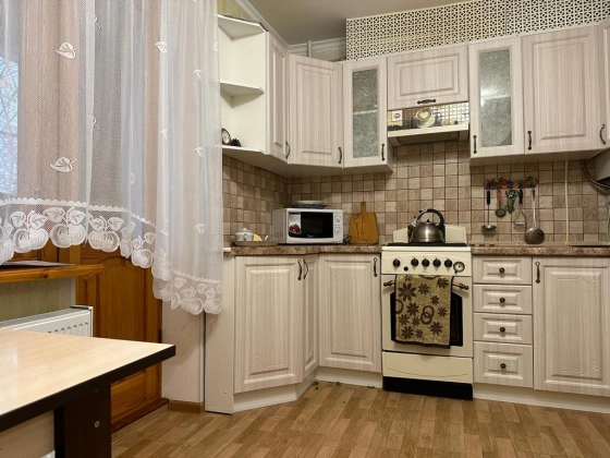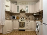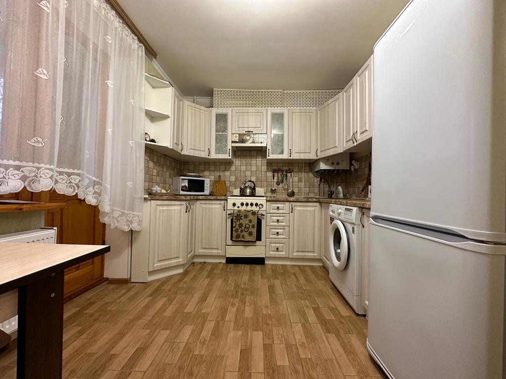 Кухня - раковина для мытья посуды, плита, шкафы для посуды, холодильник с морозильной камерой, микроволновка, а также стиральная машина.
