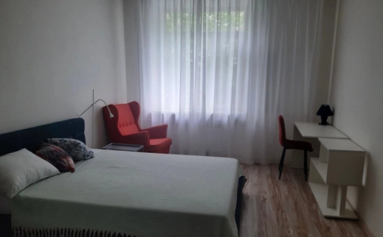Квартира на втором этаже. Окна кухни, спальни и балкон выходят во двор. Балкон застеклён.